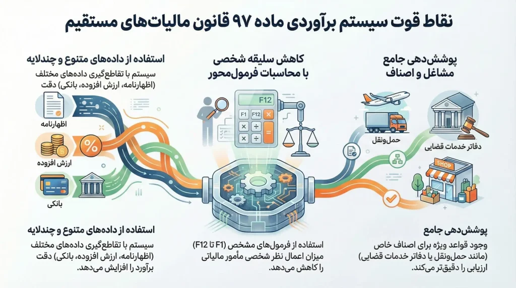 - فرمولمحور بودن محاسبات (کاهش سلیقه شخصی): فرمولهای مشخص F1 تا F12 چارچوب محاسباتی مأمور مالیاتی را تعریف میکنند. این امر، گرچه کاملاً سلیقه را حذف نمیکند، اما میزان ابهام و اعمال نظر شخصی در فرآیند تشخیص را بهشدت کاهش میدهد.